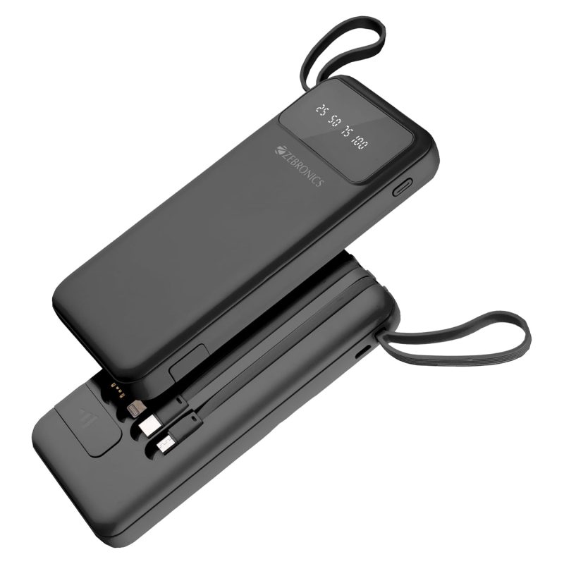 MB10000S6 Power Bank, 10000 mAh, 12W, 5 x Outputs - Dual USB A | Type C |Micro USB Input| Lightning, Built in I/O Cables, Percentage Display, Carry Loop, Made in India (Black)