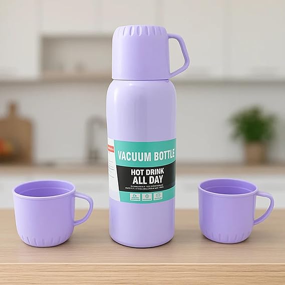 Flask Set Stainless Steel Thermos with 3 Cup Creative Gift Set with Cover Handle Portable Car Water Bottle Set (Approx 500ml)