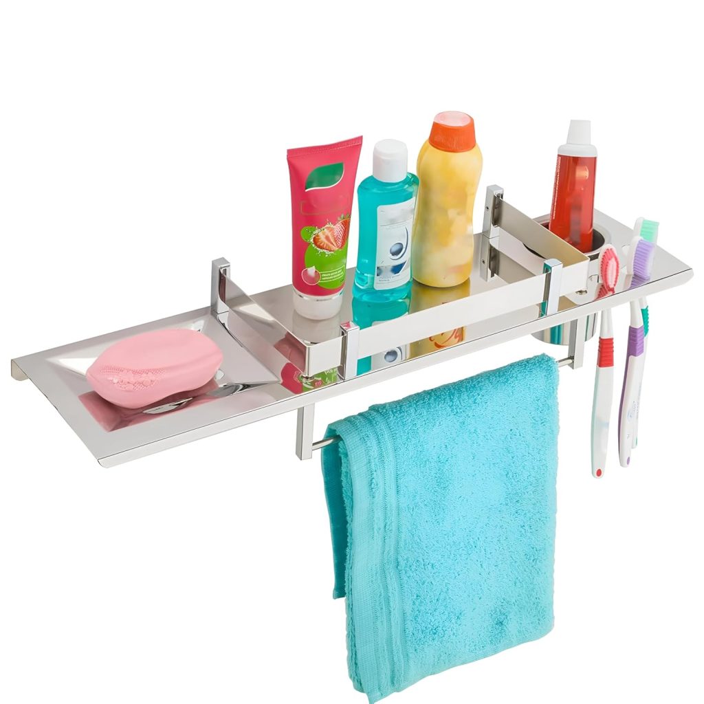 4 in 1 Stainless Steel Bathroom Shelf Multipurpose Home Accessories Organizer Set Corner Wall Mount Rack with Mirror Finish Holder for Towel Soap & Toothbrush (Pack of 1, Silver)