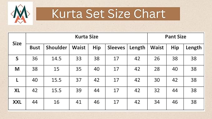 - Style: Straight || Length: Knee Length || Sleeves: ¾ Sleeves || Size Chart- Kurta-S-36 in, M-38 in , L-40 in , XL-42 in , XXL-44 in,Pant :- S-28 in, M-30 in , L-32 in, XL- 34 in , XXL- 36 in,For More Please refer to the size Chart below.